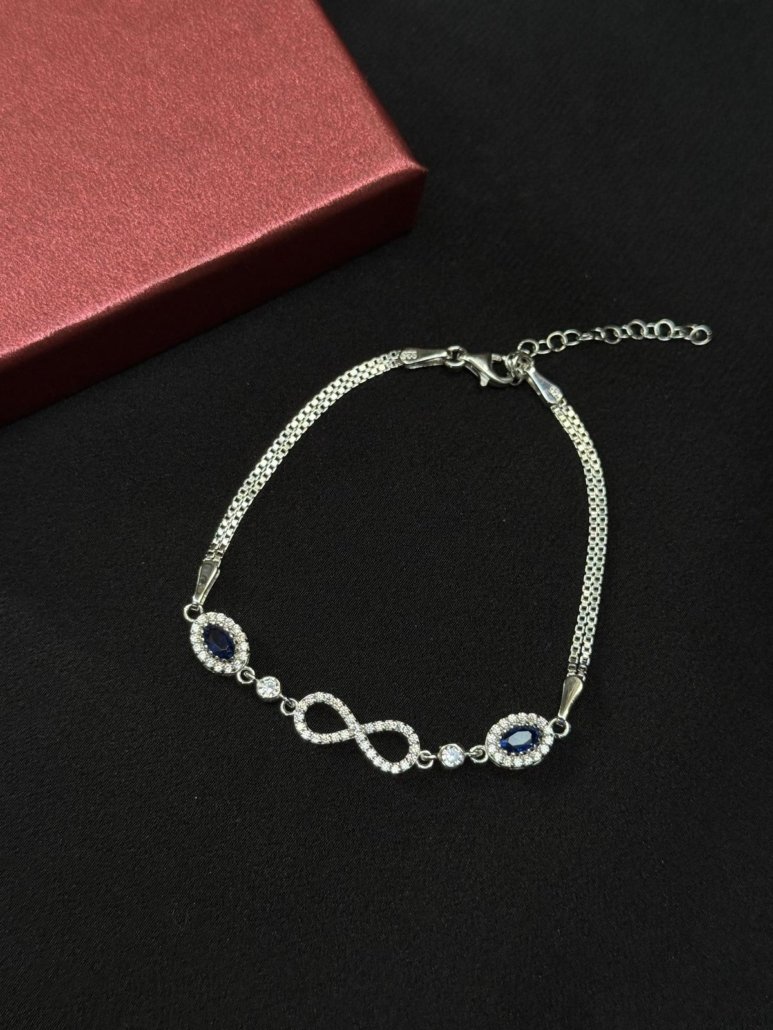 925 Ayar Mavi ve Beyaz Zirkon Taşlı Sonsuzluk Gümüş Kadın Bileklik, sevgi, sadakat ve sonsuzluk kavramlarını bir arada taşıyan zarif bir tasarıma sahiptir. Mavi ve beyaz taşların uyumu, bilekliğe hem asil bir görünüm hem de göz alıcı bir parıltı kazandırır.