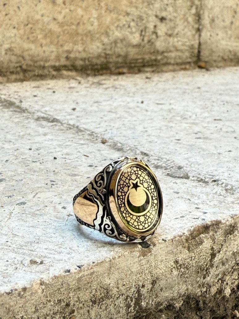 Vatan sevgisini stiline yansıtmak isteyenler için özel olarak tasarlanan bu yüzük, Ayyıldız sembolünün güçlü anlamını ve geleneksel motifleri bir araya getiriyor. Türk bayrağının simgesi olan ay ve yıldız figürleri, yüzüğün tam merkezinde dikkat çekici bir şekilde işlenmiş; etrafı ise Osmanlı ve Selçuklu esintileri taşıyan detaylı motiflerle süslenmiştir.