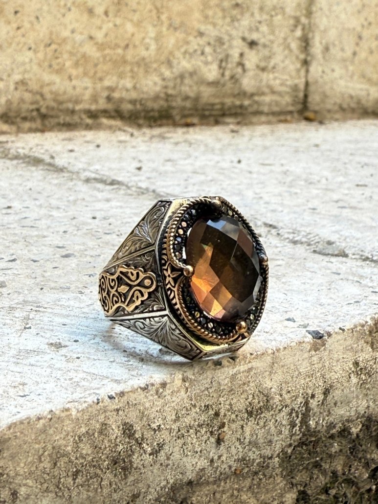 Doğadan gelen zarafeti, el işçiliğinin ustalığıyla birleştiren bu 925 ayar fasetli Zultanit taşlı erkek gümüş yüzük; hem estetik hem de anlam yüklü bir tasarıma sahiptir. Yüzüğün merkezinde yer alan fasetli (çok yüzeyli) kesimle parlatılmış Zultanit taşı, ışıkla etkileşime girerek farklı açılarda renk değiştirir. Gündüz ışığında yeşil ve sarı tonlarını yansıtan taş, yapay ışık altında pembe ve kehribar renklere dönüşerek her ortamda farklı bir hava yaratır.