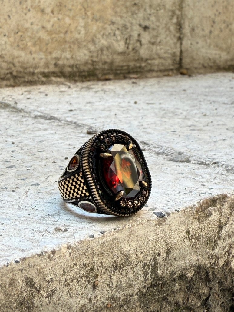 Lal taşı (garnet), tarih boyunca cesareti ve kararlılığı simgelemiş, kalp çakrasını dengelediğine ve taşıyıcısına içsel güç verdiğine inanılmıştır. Bu taş, özellikle kararlılığa, tutkulara ve fiziksel canlılığa ihtiyaç duyanlar için ideal bir seçimdir. Yüzüğün merkezinde dikkat çekici şekilde yer alan lal taşı, oksitli gümüş detaylarla çevrelenmiş ve geleneksel bir karakterle harmanlanmıştır.