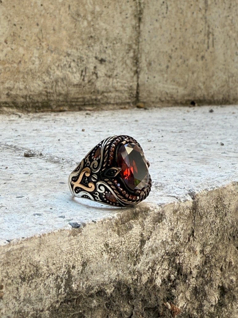 Tarih boyunca kralların, savaşçıların ve liderlerin taşı olarak bilinen lal taşı (garnet), bu özel tasarım 925 ayar gümüş erkek yüzükte hayat buluyor. Koyu kırmızıya çalan derin rengi ve doğal ışıltısıyla dikkat çeken bu taş, sadece estetik değil; aynı zamanda enerjik ve anlamlı bir parça olarak öne çıkıyor.