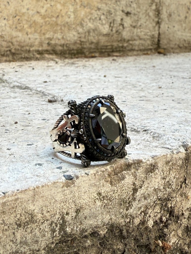 Yüzüğün tasarımı, oksitli gümüş işlemelerle güçlendirilmiş olup, geleneksel ve modern çizgileri bir arada taşır. Oksit kaplama, yüzüğe karartılmış, maskülen bir görünüm kazandırırken; oniks taşının parlak dokusu ile kontrast oluşturarak göz alıcı bir duruş yaratır.
