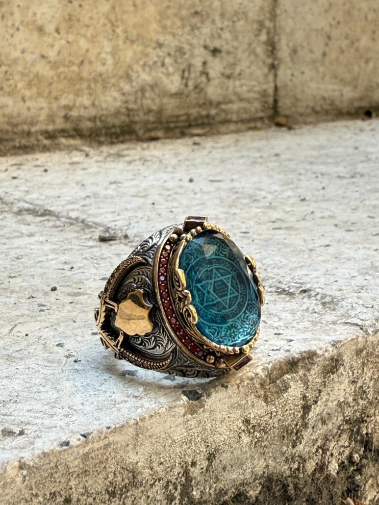 Bu özel taşın tam üzerinde yer alan Süleyman Mührü (Seal of Solomon) motifi ise; bilgelik, kudret, koruma ve ruhani güçleri temsil eder. Eski metinlerde ve inanç sistemlerinde önemli bir sembol olan bu mühür, yüzüğe yalnızca estetik değil, aynı zamanda derin anlamlar da kazandırmaktadır. Mührün etrafındaki ince işlemeler, gümüşün oksitli yüzeyiyle birlikte yüzüğe antik ve karizmatik bir hava katmaktadır.