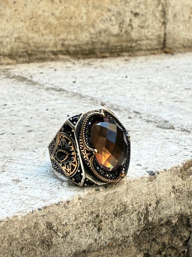 Yüzüğün gövdesi, oksitli gümüş ile koyu renklendirilmiş ve detaylı motiflerle zenginleştirilmiştir. Oksitli kaplama, taşın parlaklığını ön plana çıkarırken aynı zamanda yüzüğe antik, erkeksi ve güçlü bir karakter kazandırır. Gümüş üzerine işlenmiş motifler, geleneksel Türk el işçiliğinin zarafetini yansıtır. Her yüzük, usta ellerden çıkan el yapımı bir sanat eseridir.