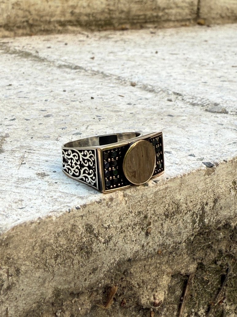925 ayar saf gümüşten el işçiliğiyle üretilmiş bu özel tasarım erkek yüzük, merkezinde yer alan yuvarlak plaka motif ile gücü, kararlılığı ve sadeliği aynı anda yansıtır. Dikkat çeken bu plaka, geleneksel ve geometrik desenlerle çevrelenmiş olup oksitli kaplama sayesinde antik bir görünüm kazanmıştır. Yüzüğün bu oksitli yüzeyi, sadece estetik değil aynı zamanda yüzüğün zamanla oluşabilecek dış etkenlere karşı daha dayanıklı hale gelmesini sağlar.